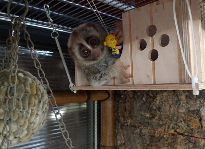 Лори – ночные и довольно скрытные животные, поэтому в клетке обязательно должно быть укрытие (домик), в котором лемур будет спать или прятаться от «недоброжелателей». Домик нужно располагать в верхней части клетки, т.к. лори – древесное животное и чувствует себя уютнее, забравшись повыше. Домик может быть и тряпичным и деревянным и пластиковым, дизайн и размеры его могут быть разными (но не нужно его делать огромным).
