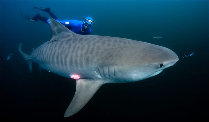 Одно из их любимых мест сборищ это залив с метким названием Shark — акулий, на западе Австралии. Плавающие на глубине в 5 метров и весящие по 900 кг(почти в 40 раз больше рифовой акулы), эти рыбы шутить не любят. По спине и бокам этих акул идут полосы, как у известной большой кошки с похожим названием. И характер у них тот еще… Даже обеды у них больше.