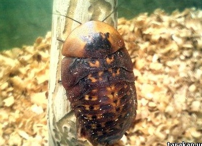 Что касается размножения, тут у тараканов творческий подход. Самец ухаживая за самкой исполняет своеобразный танец вокруг неё, затем разворачивается к ней задом и расправляет крылья, выглядит это очень эффектно! Если ему удалось очаровать самку, то та залезает к нему на спину и начинается собственно спаривание, которое длится обычно от получаса до часа(однако был в моей памяти случай, когда спаривание длилось чуть более двух суток, но это скорее как исключение). Вид относится к яйцеживородящим, т.е. самка после спаривания носит оотеку в брюшке до самого рождения потомства, а не сбрасывает её. Беременность длится около 4 месяцев, в этот период самка может «проветривать» оотеку, высовывая её практически на всю длину, затем спустя какое-то время, втягивает её обратно, оотека имеет розовый цвет. К моменту родов самка сбрасывает оотеку, одновременно с этим из оотеки рождаются нимфы размером около 7 мм в длинну и 3 мм в ширину. Количество нимф при нормальной температуре и достаточном питании с одной оотеки около 30. Сразу после родов самка и новорожденные приступают к поеданию остатков оотеки. Сброшенная раньше положенного срока(4 месяца) оотека не развивается, потомство, находящееся в ней погибает и сохранять её «на дозревание» нет никакого смысла. Развитие нимф проходит, как уже говорилось примерно 8 линек, первоначально интервал между линьками примерно 20 дней, постепенно удлиняясь до 1 месяца(даже до полутора месяцев). Таракан живёт, по литературным данным, 1.5 года — возможно в природе так оно и есть, мои тараканы уже достигли возраста 2-х лет и продолжают давать потомство. От 8 до 12 месяцев существует в виде личинки, затем совершает «финальную» линьку и становится имаго, в этом виде она живёт ещё примерно год, давая потомство.